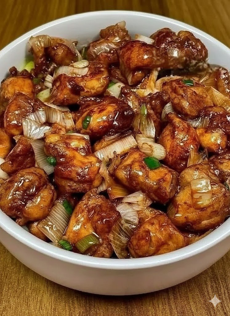 This dish features succulent pieces of chicken stir-fried to perfection, likely coated in a savory, slightly sweet, and glossy sauce. It's generously mixed with vibrant green onions (scallions), which add a fresh, pungent bite and a touch of color. The overall impression is a classic, flavorful Asian-inspired stir-fry that's both comforting and satisfying.